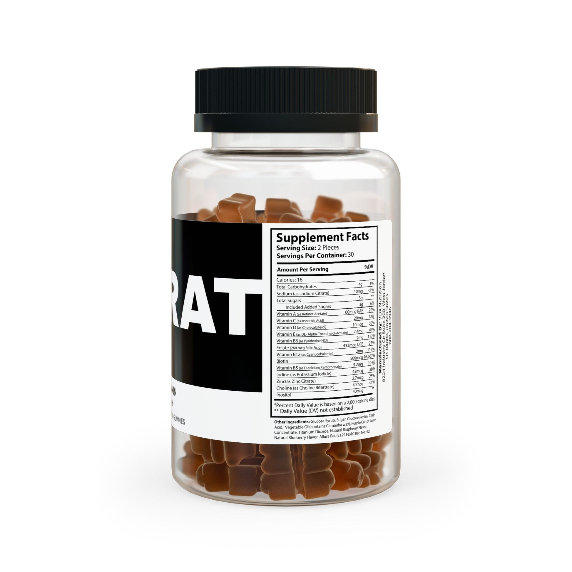 Ingredients: Vitamin A (as Retinot Acetate), Vitamin C (as Ascorbic Acid), Vitamin D (as Cholecalciferol), Vitamin E (as DL- Alpha-Tocopherol-Acetate), Vitamin B6 (as Pyridoxine HCl), Folate (260 mcg Folic Acid), Vitamin B12 (as Cyanocobalamin), Biotin, Vitamin B5 (as D-calcium Pantothenate), Iodine (as Potassium Iodide), Zinc(as Zinc Citrate), Choline (as Choline Bitartrate), Inositol. Other Ingredients: Glucose Syrup, Sugar, Glucose,Pectin, Citric Acid, Vegetable Oil(contains Carnauba wax), Purple Carrot Juice Concentrate, Titanium Dioxide, Natural Raspberry Flavor, Natural Blueberry Flavor, Allura Red(E129 FD&C Red No. 40).